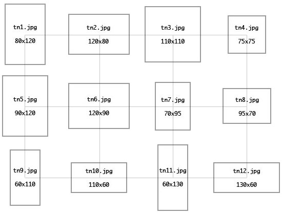 Since the rows of DIVs containing thumbnail images are treated as "lines" by web browsers/CSS, we can simply set the line-height of the single large DIV which contains the smaller thumbnail DIVs to a height which keeps the thumbnails spaced vertically with the same breathing room set for the horizontal spacing. We do this as part of the actual HTML. The larger DIV containing the whole thumbnail gallery can be dimensioned and positioned wherever the designer wants it, but for this example it will be set with a width of 600px. Changing the width automatically redefines the number of columns/rows to fit.
